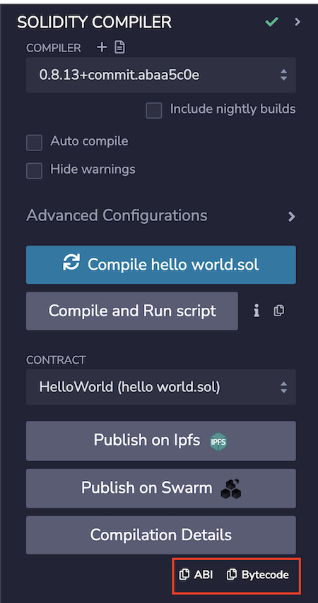The contract ABI and Bytecode are available on the Solidity compiler tab.