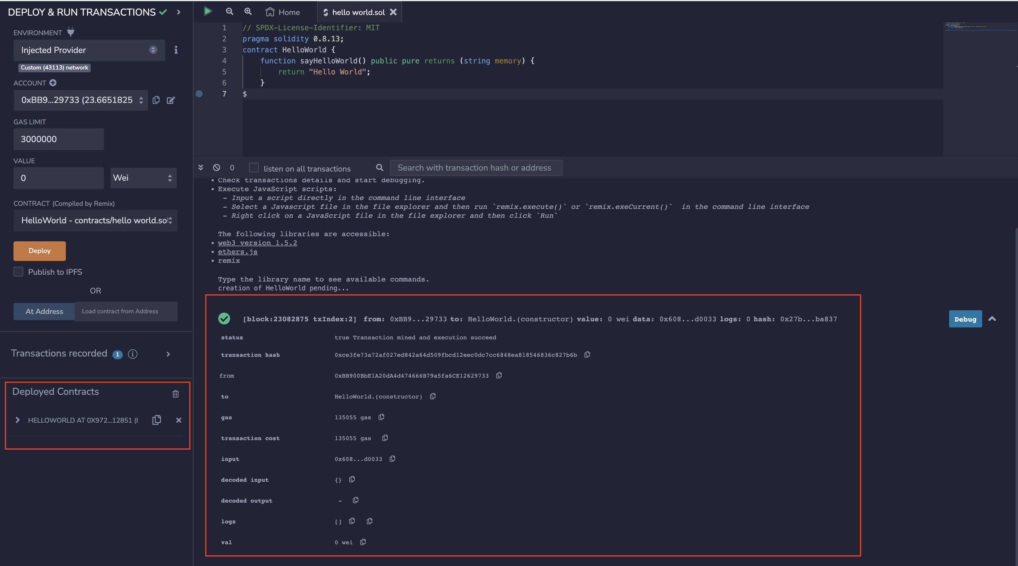 Now, the smart contract is compiled, Core is injected, and we are ready to deploy our Hello world contract. Click "Deploy."